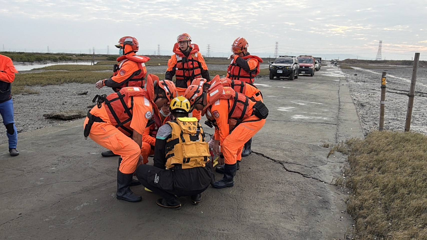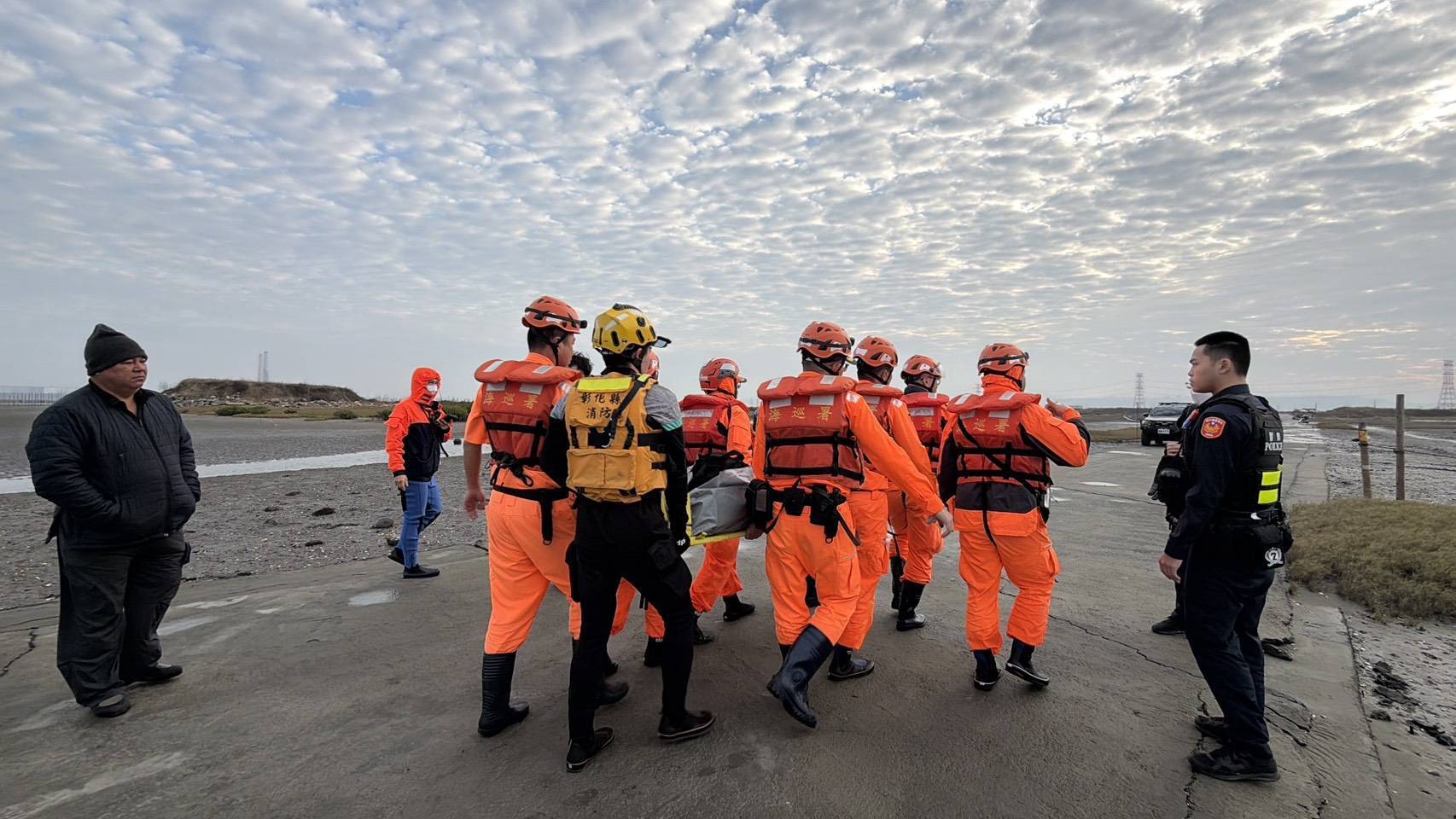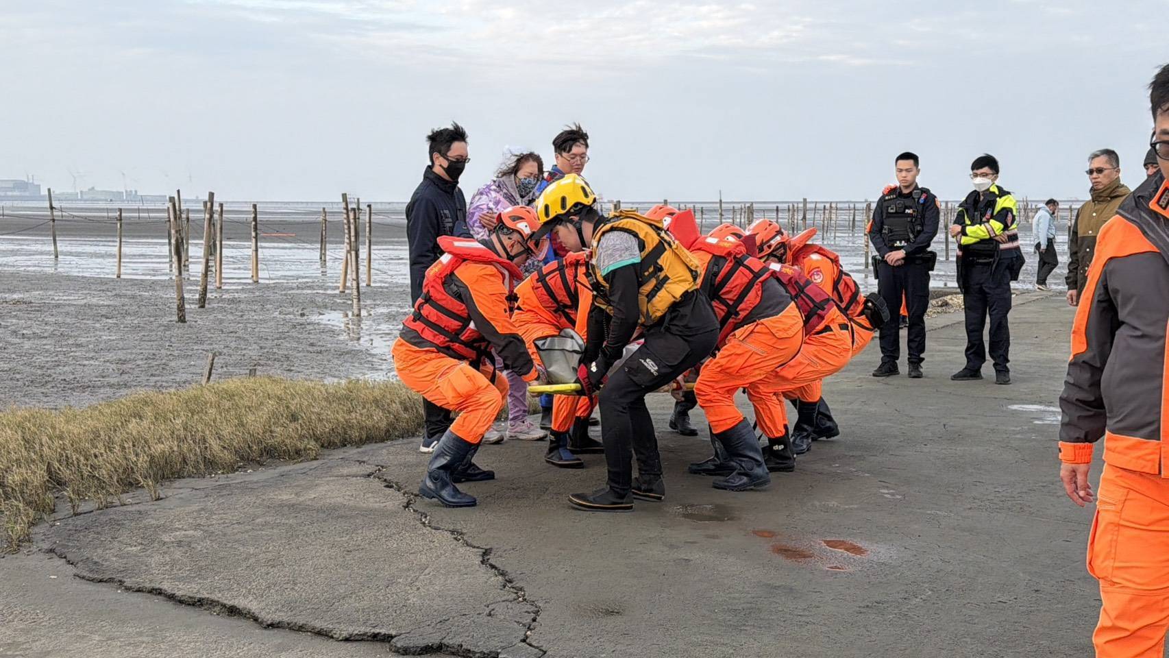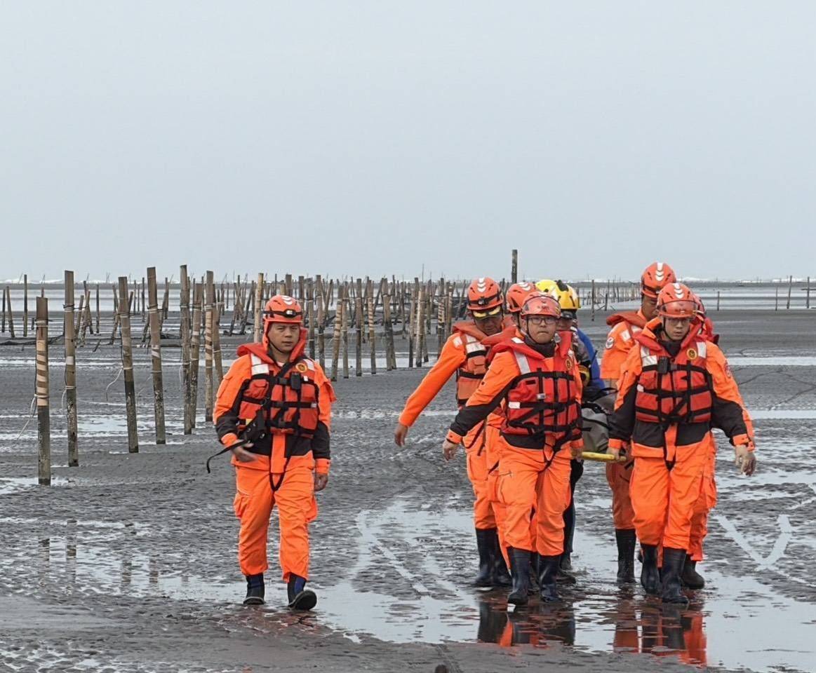今(18)日6時,海巡及消防人員於海尾蚵道集結;6時34分,在地蚵農通報於距岸1公里處發現倒地民眾,消防及海巡人員利用長背板,涉水將民眾搬運回岸邊,經查看已無生命跡象,並確認為昨(17)日落水男子,後續將協助處理相驗事宜。