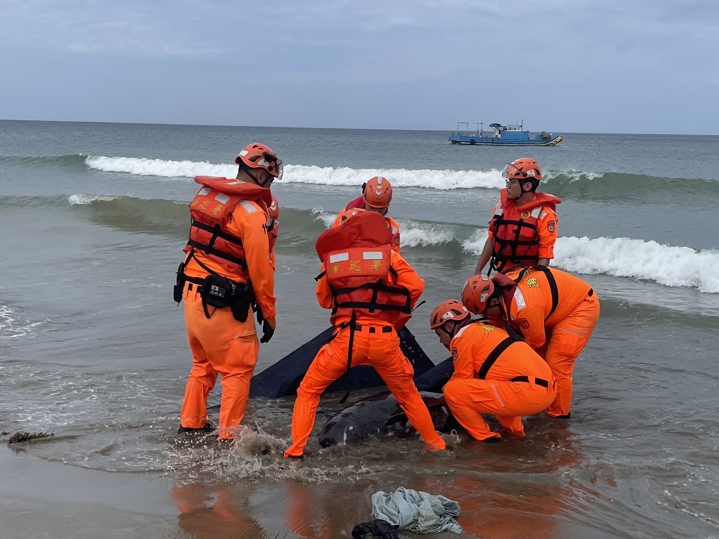 今(24)日上午7時許,車城鄉海口沙灘驚傳小虎鯨集體擱淺情事,海巡署第八巡防區指揮部接獲民眾通報後,立即派遣海口安檢所、第二機動巡邏站及周邊鄰近單位攜帶鯨豚救援裝備趕赴現場應處,並同步通報海洋委員會海洋保育署屏東海洋保育工作站與國立成功大學鯨豚中心派員前往協助處理。