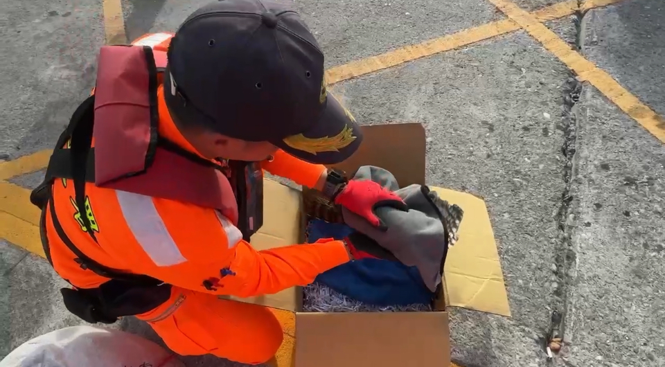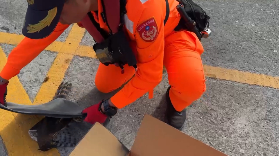 海巡人員即刻於現場妥善保護該猛禽,並通報臺東縣政府畜產保育科及海洋保育署臺東海洋保育站協助;經專業人員確認,該猛禽為二級保育類野生動物-鳳頭蒼鷹,後續由臺東縣政府畜產保育科接手帶回安置並後送照護。