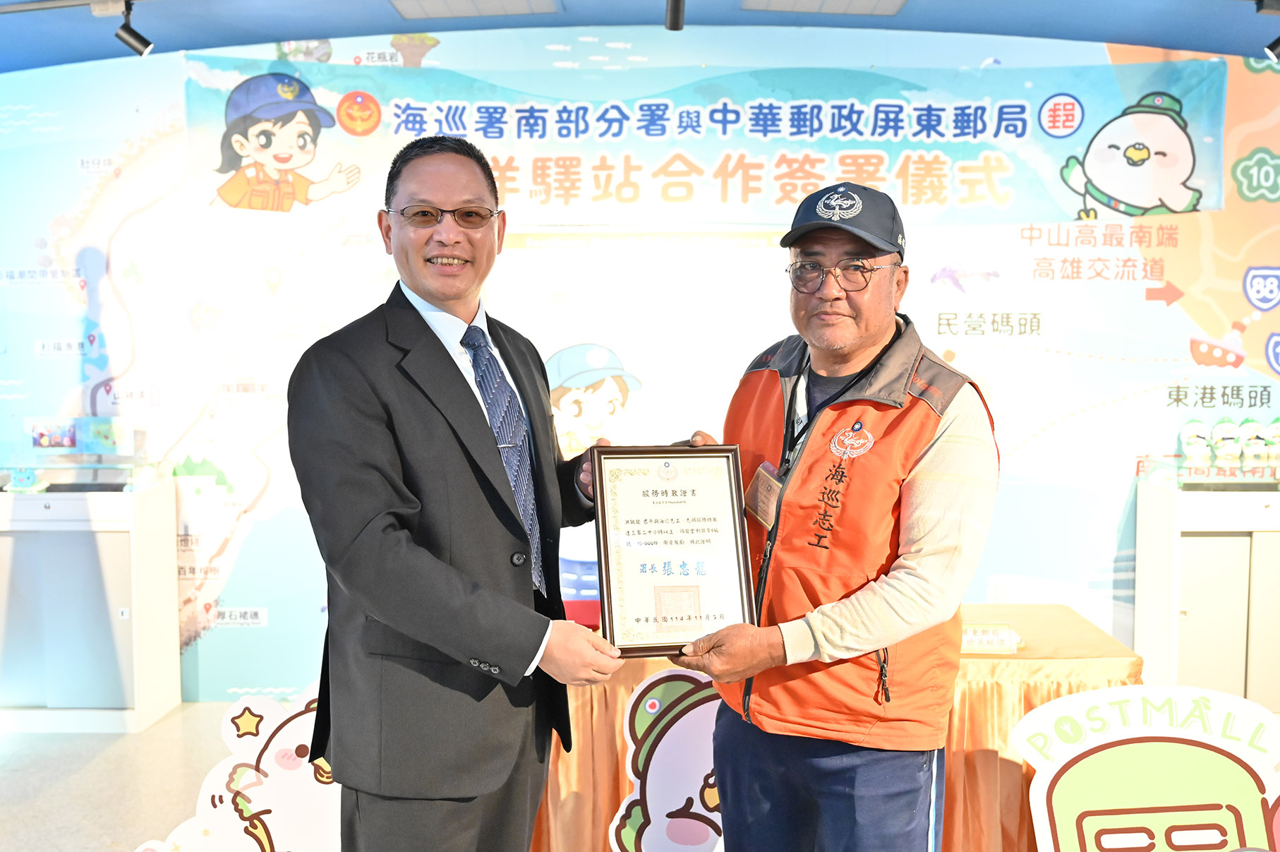 分署長鳳運昇致詞指出,海洋驛站是推廣海洋環境教育的重要平台,此次與屏東郵局合作,在既有場域中融入郵政元素與特色陳展,不僅強化地方文化意象,也讓更多旅客在參觀過程中了解海洋保育與郵政文化的多元面貌。目前海巡署南部分署轄內4處海洋驛站中,鼓山及興達海洋驛站已於今年起與高雄郵局合作設置主題展示,今日再由屏東郵局加入行列,共同推動琉球及屏東興海海洋驛站發展,同時還推出南部地區限量「海洋驛站主題明信片套組」與「紀念章」,讓民眾在寄信與參觀之間感受守護海洋的理念。