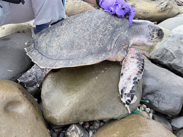 今(21)日上午9時26分,海巡署第十巡防區指揮部接獲民眾通報,於臺東市漂流木石滬沙灘發現活體欖蠵龜1隻,其右前肢遭漁網纏繞,請本署協處。