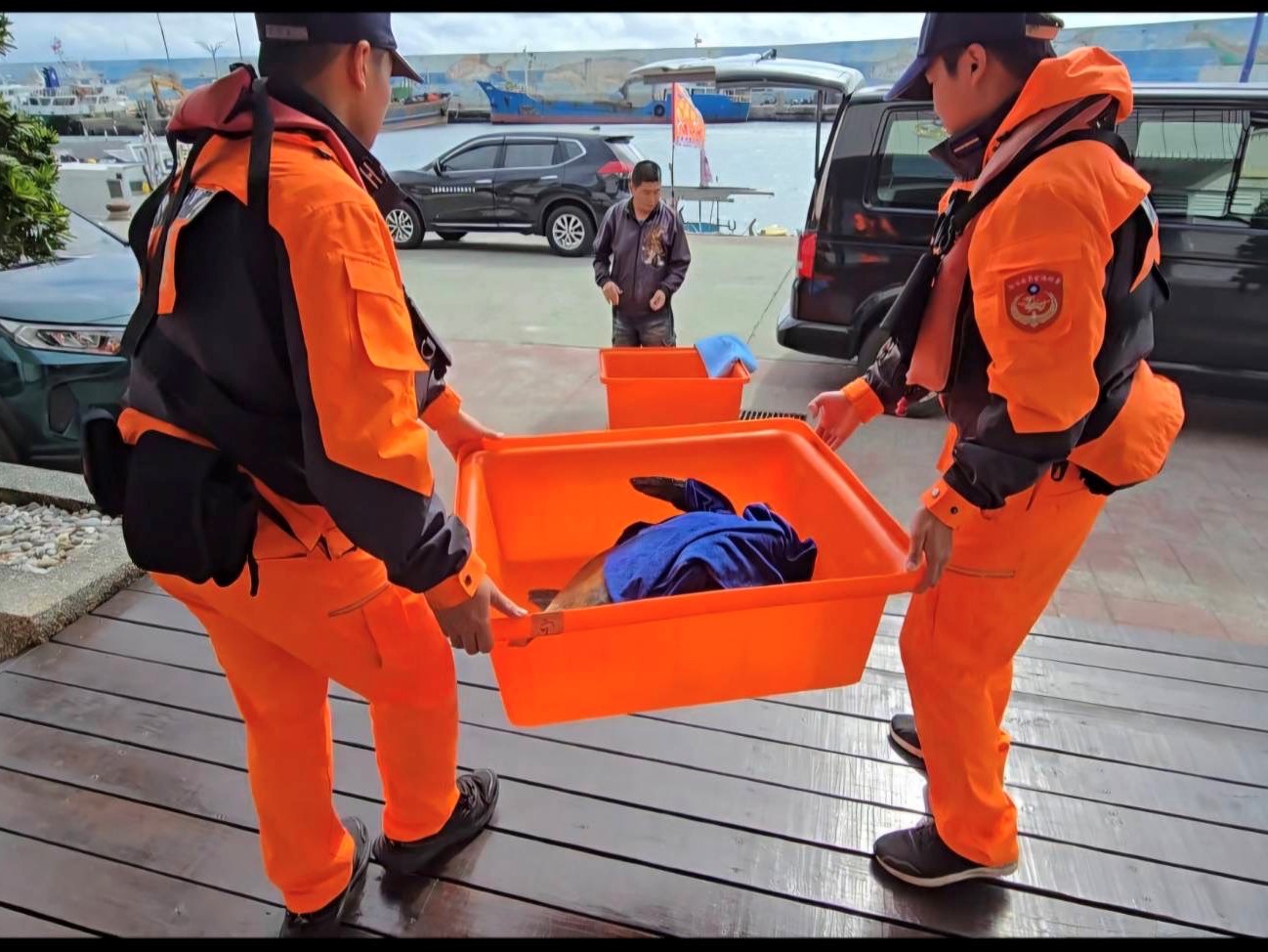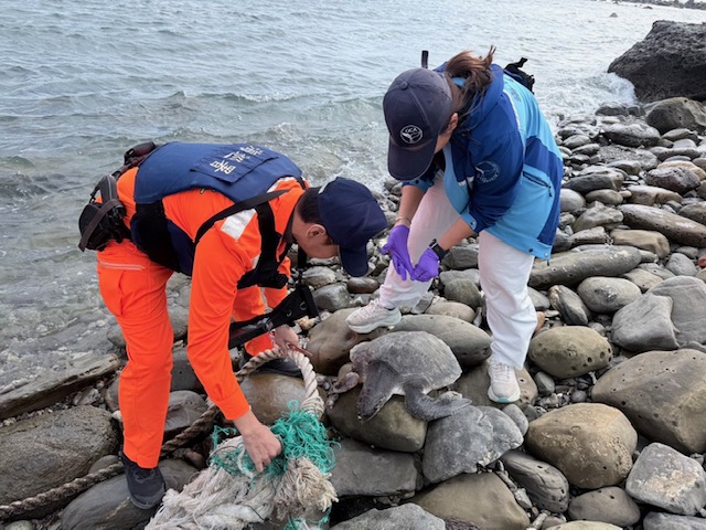 第一三岸巡隊第二機動巡邏站接獲通報後,立即派員趕赴現場後,經檢視個體狀況及種類,旋即通報臺東縣政府林務保育科及海洋保育署臺東海洋保育站,由專業人員判斷該海龜品種為欖蠵龜,並協助將纏繞之漁網取下,後續將該海龜交由臺東縣政府畜產保育科後送至國立海洋生物博物館醫治。