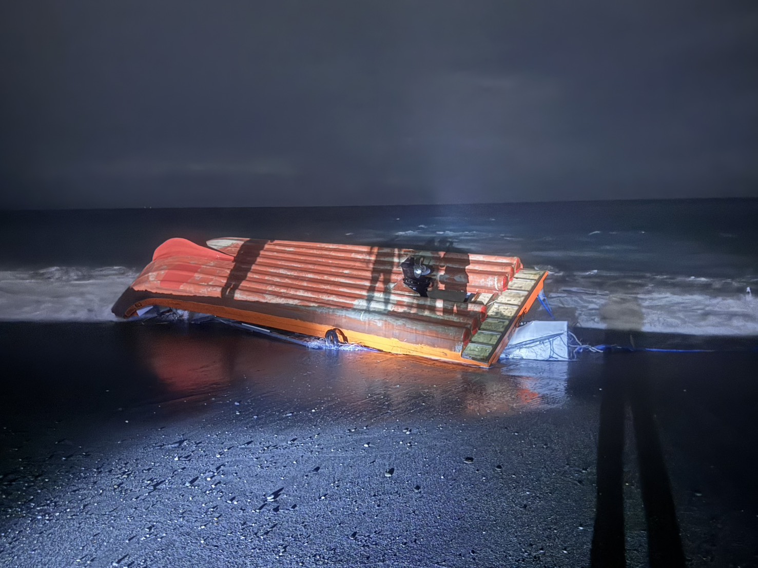 今(6)日02時15分,美和安檢所通報,大武漁港籍作業膠筏「榮○號」遭側浪翻覆後擱淺於守望哨前方岸際,本署立即派員馳援,現場發現船上2名漁民已自行上岸,所幸無礙。