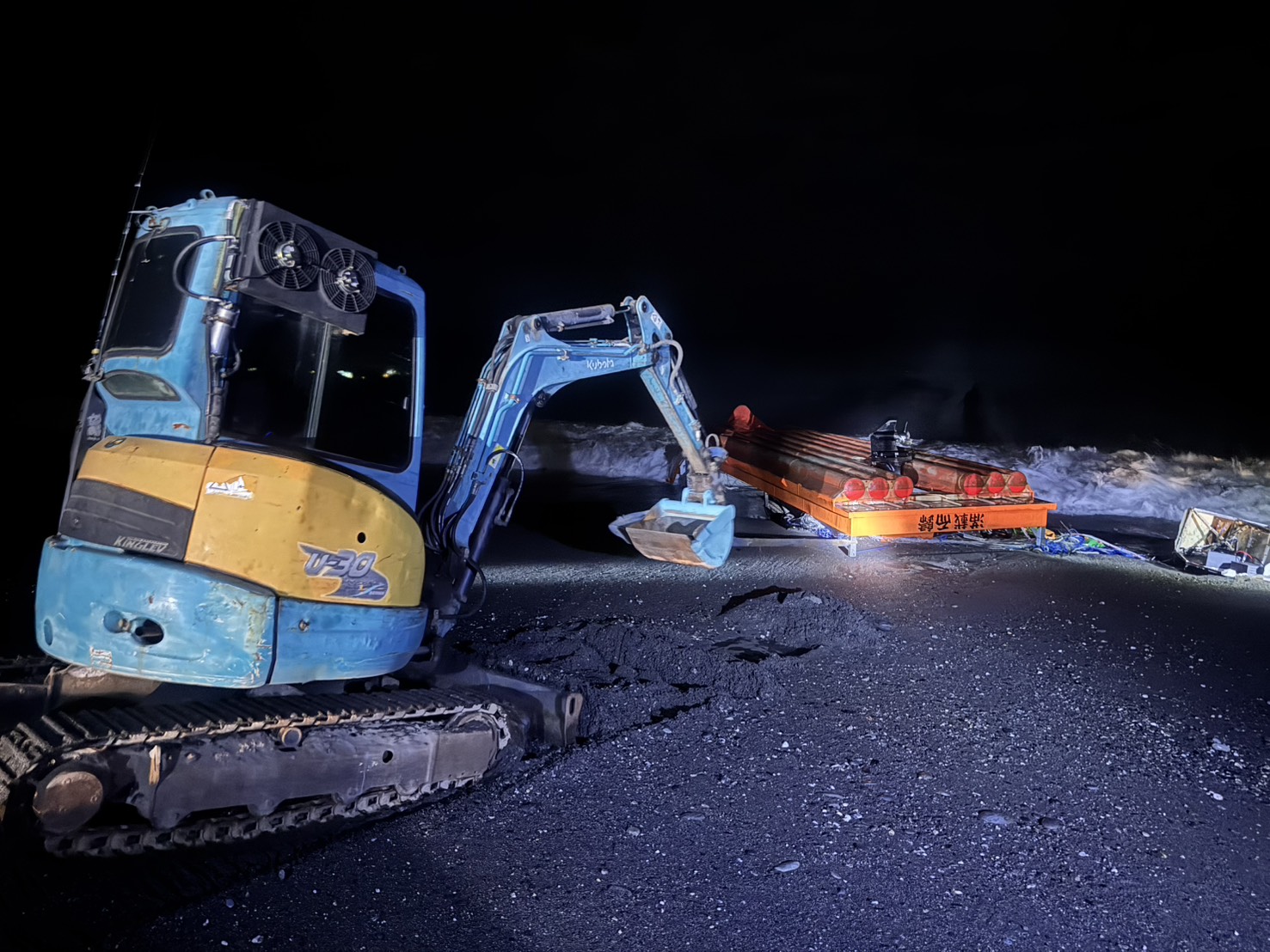 第一三岸巡隊獲報後立即派遣美和安檢所、第三機動巡邏站攜帶相關救援裝備於事發現場協處,並通報臺東縣消防局臺東大隊知本分隊及第十五海巡隊協處,船長已協請重型機具協助脫困;04時46分,「榮」船脫困上岸,本署同仁檢視現場環境,均無發現油汙滲漏及可疑物品,後續由消防救護人員評估上岸漁民均無外傷。