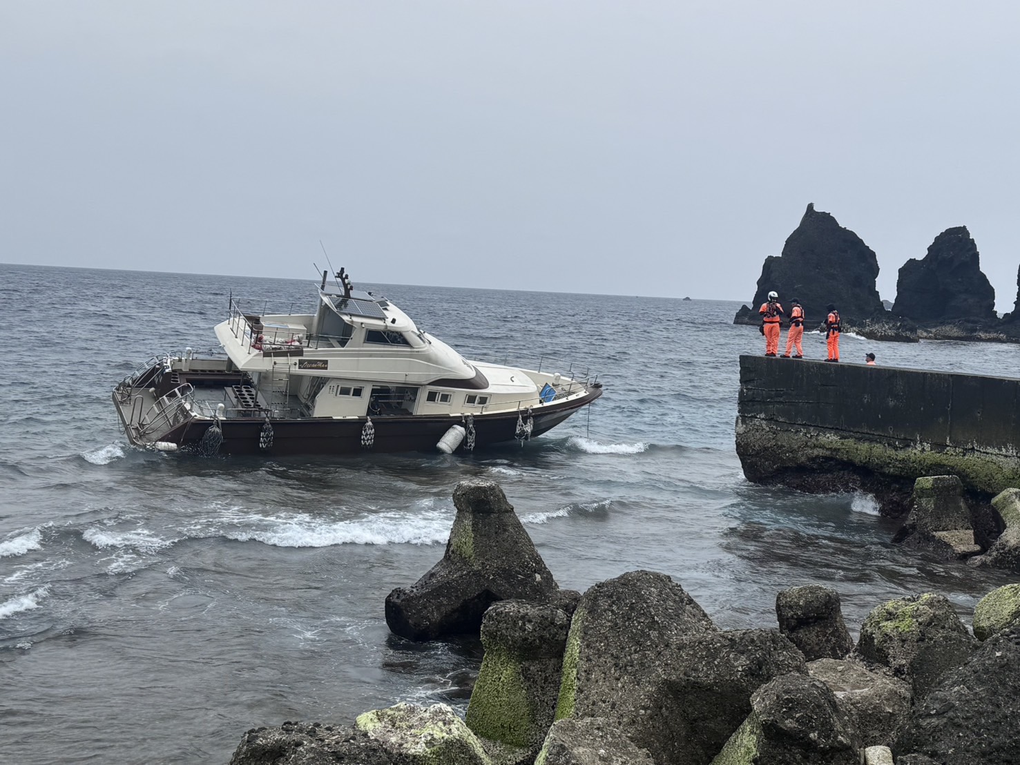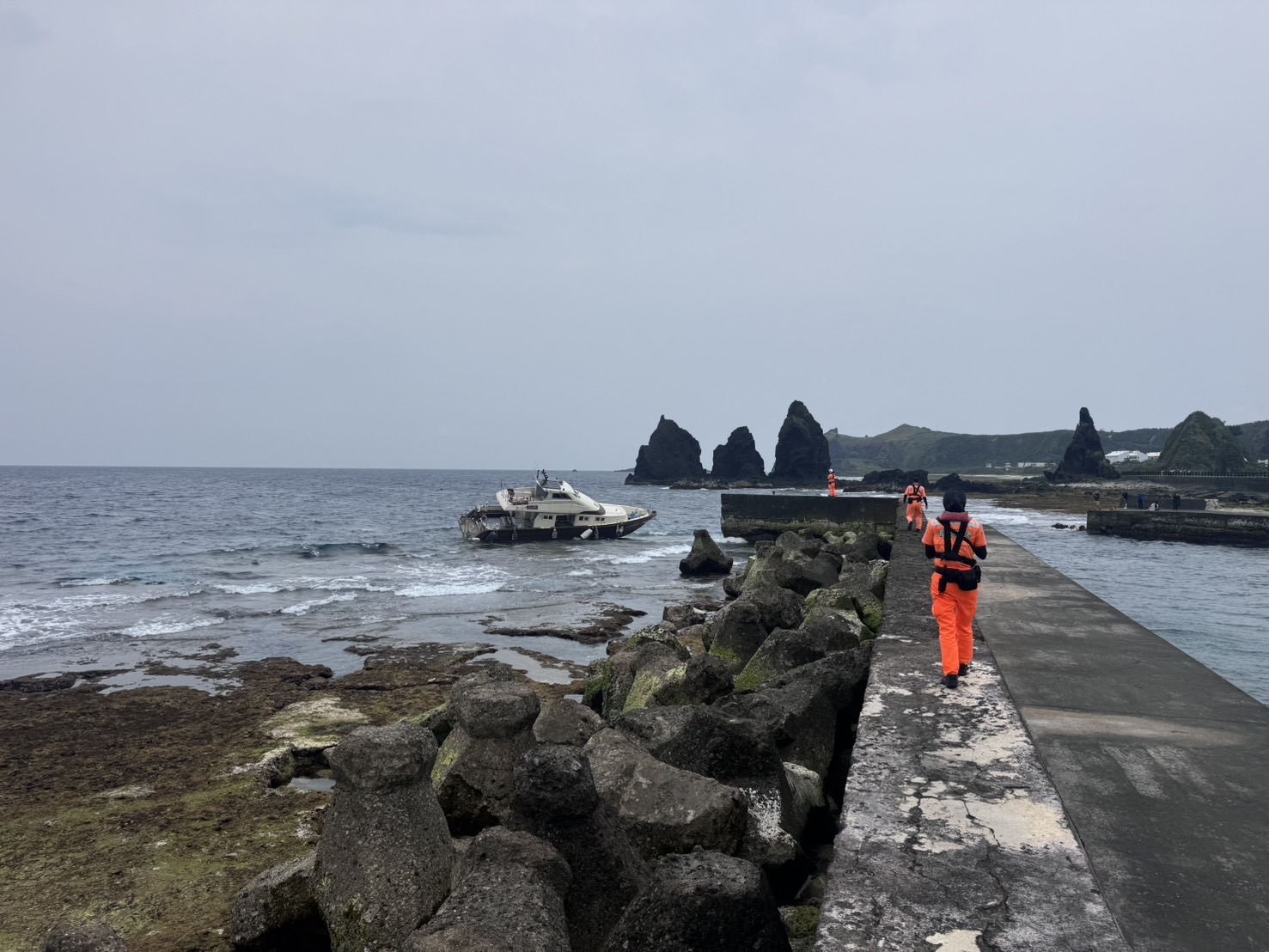 東部分署第一三岸巡隊表示,綠島漁港安檢所檢查人員發現後立即啟動救援機制,並回報第十巡防區指揮部協助通報第十五海巡隊PP-10068艇前往現場協助救援。安檢所人員抵達現場後協助2名船員及24名遊客安全上岸,人員均平安無受傷情形。經詢問船長初步表示擱淺原因係因舵機損壞導致無法控制船隻,又受到西南氣流影響遭浪拍打至岸際導致擱淺。目前船上尚有柴油約600公升,因目前風浪不佳且潮水過低無法實施拖帶作業,已先將船體固定,並協調友船預計於明(5)日07時20分滿潮時段協助拖帶。目前船隻周邊無油汙情事,海巡人員已備妥海汙應變資材,以防止油汙外洩情形。