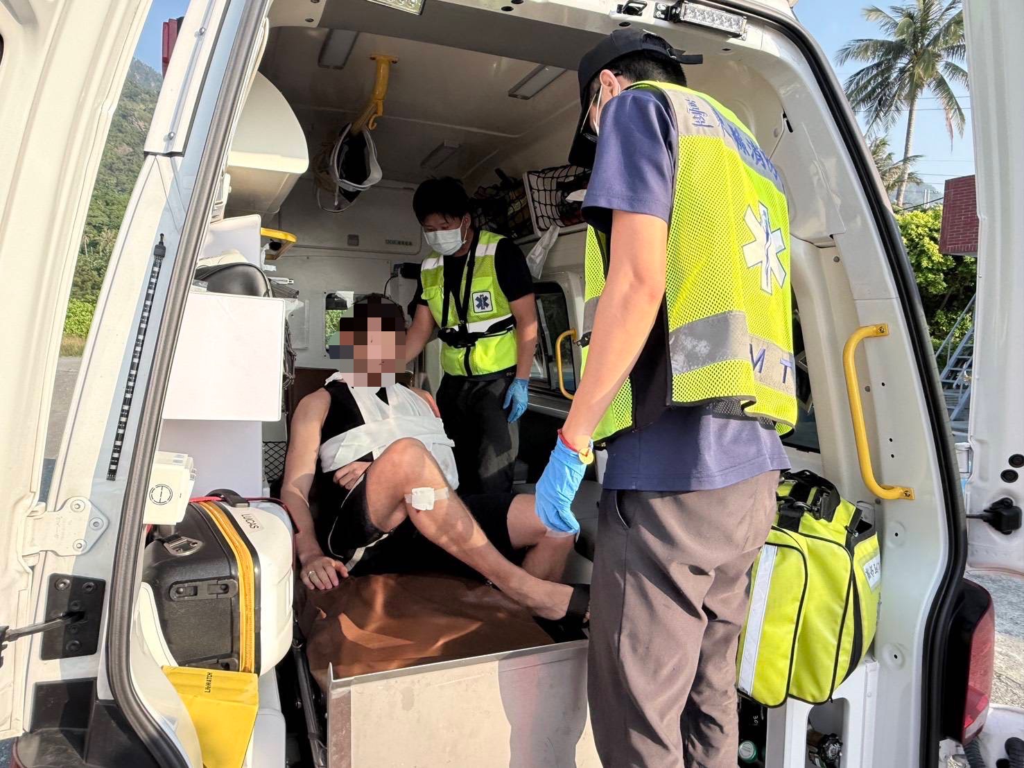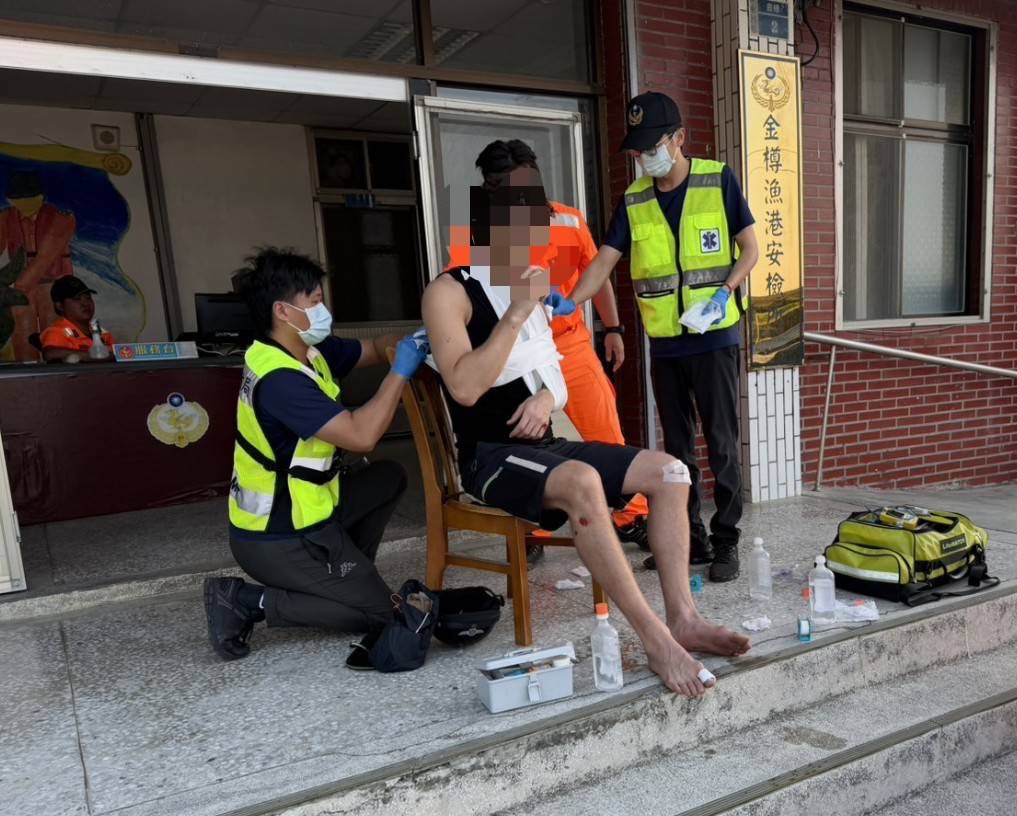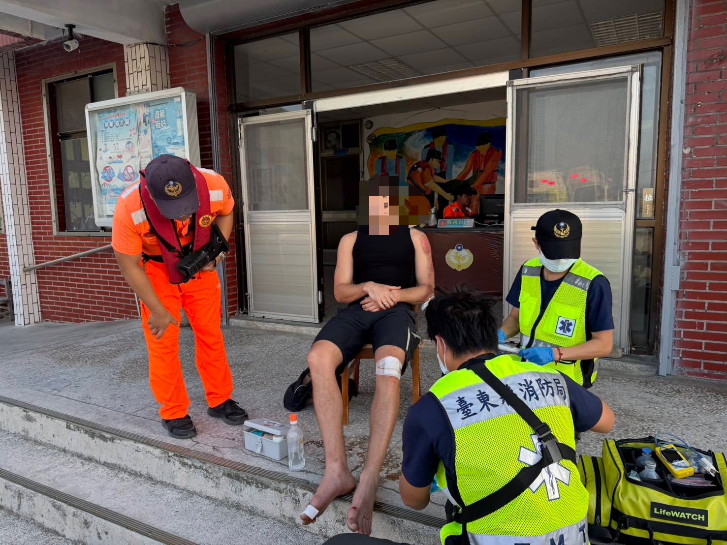 經初步了解,該名衝浪客因野狗突然竄出車道,閃避不及而失去重心倒地。金樽安檢所立即通報臺東縣消防局成功大隊東河消防分隊派員協處,並由檢查人員於現場先行檢傷評估,發現傷患左腳背有擦挫傷,左肩膀出現瘀青且無法抬舉,惟意識清楚、生命徵象穩定,其餘部位暫無明顯外傷。為確保傷患安全,檢查人員隨即攙扶其返回安檢所內休息並持續觀察,待東河消防分隊人員抵達現場接手包紮並後送臺東基督教醫院。
