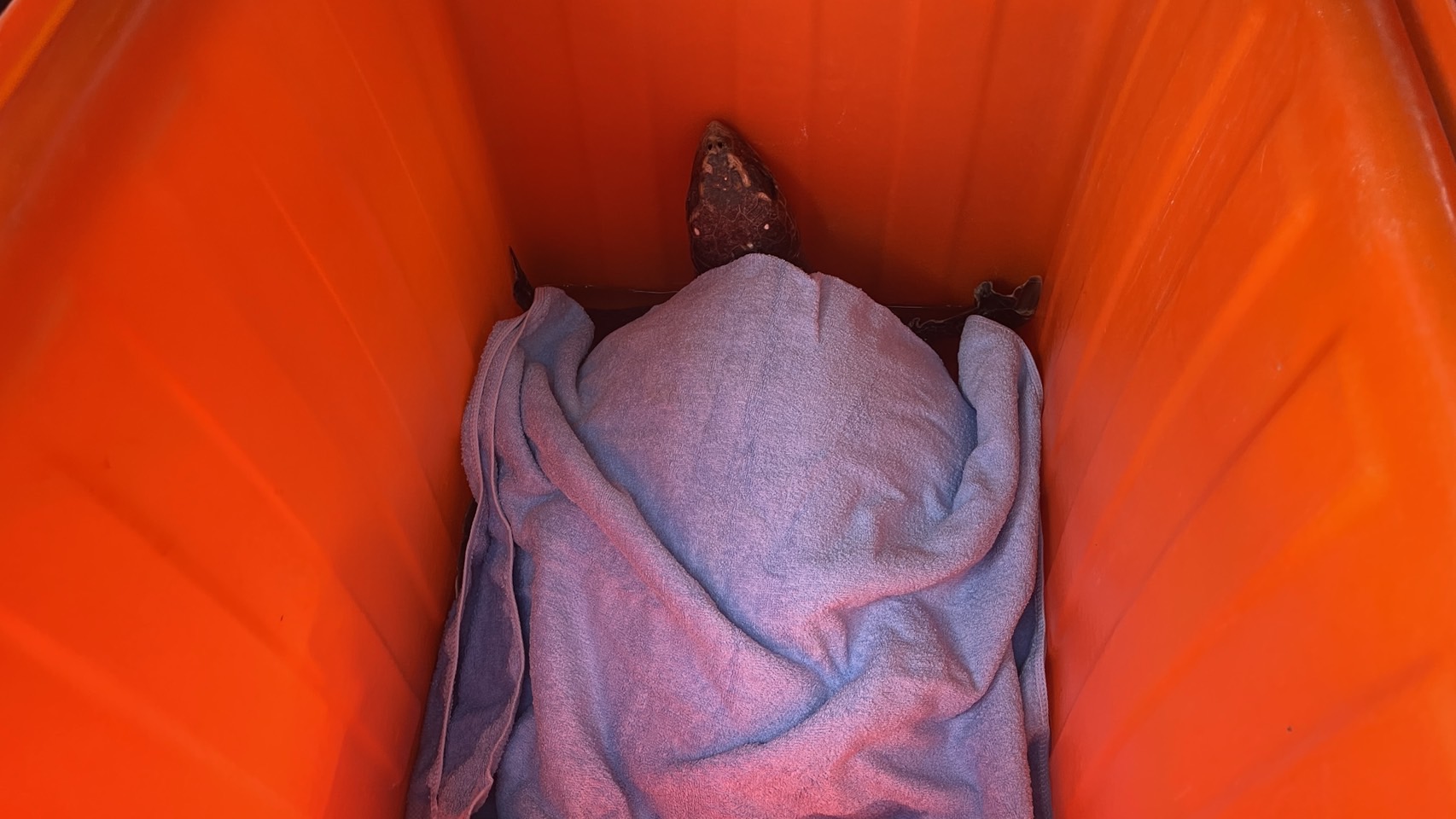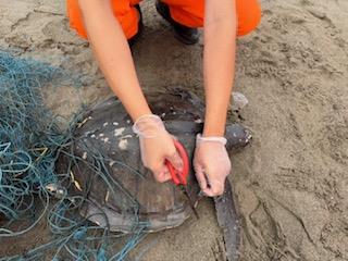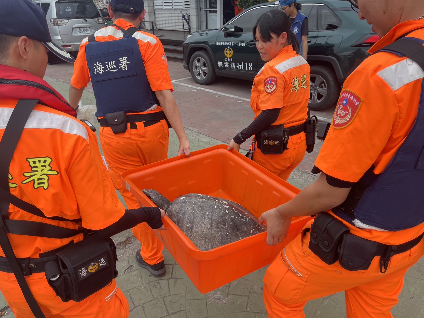 第一三岸巡隊第二機動巡邏站接獲通報後,立即派員趕赴現場,經檢視個體狀況,隨即協助移除纏繞漁網,並通報臺東縣政府畜產保育科及海洋保育署臺東海洋保育站,經專業人員判斷該海龜品種為欖蠵龜,後續將該海龜交由臺東縣政府畜產保育科後送至國立海洋生物博物館醫治。
